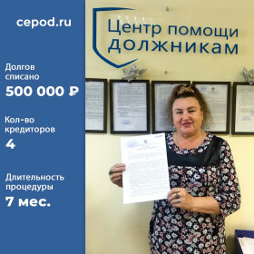Списано долгов на 500 000р. за 7 месяцев. Кол-во кредиторов - 4 шт.
